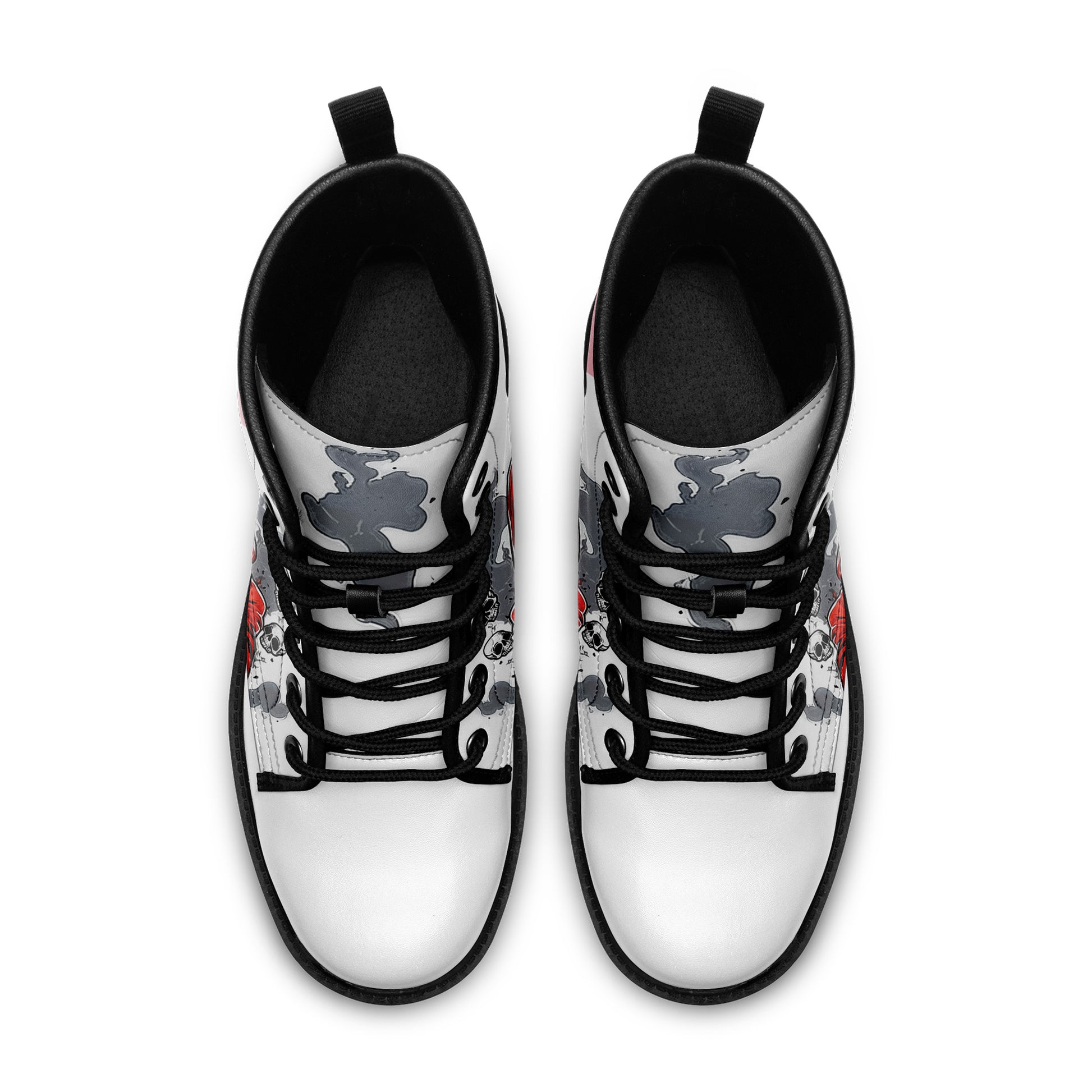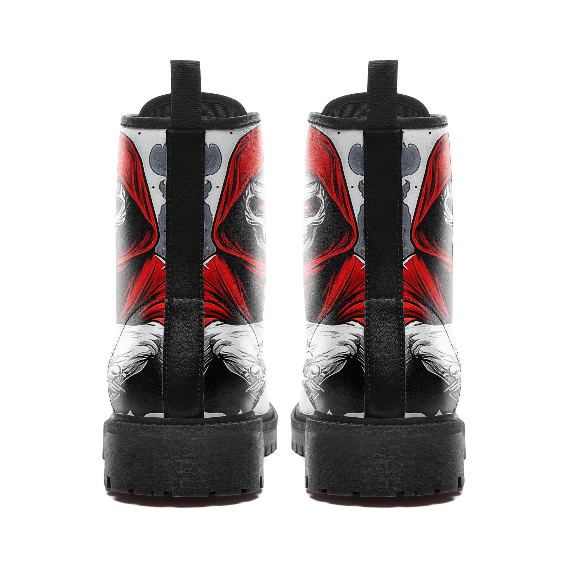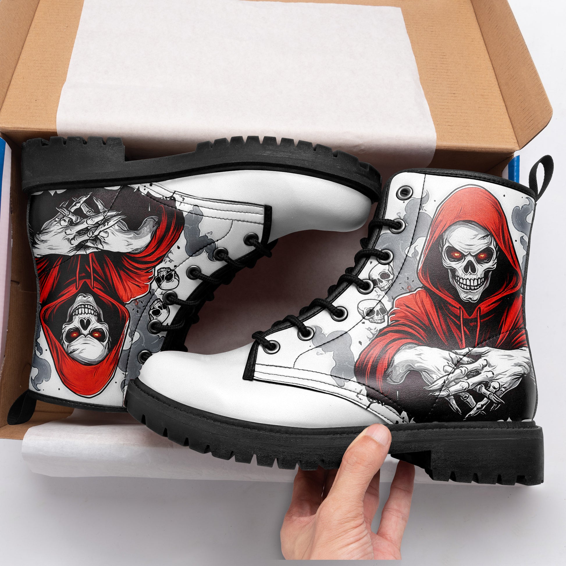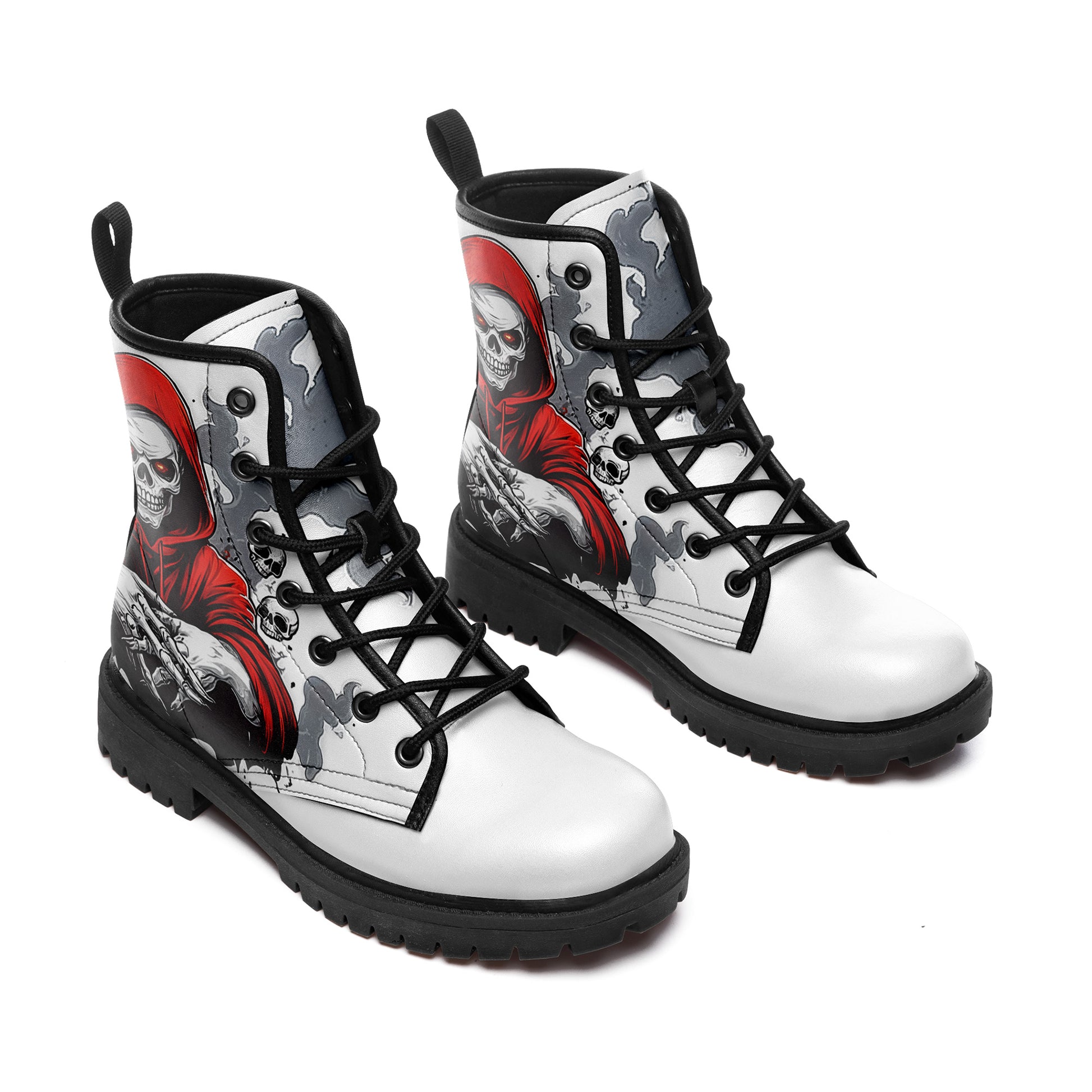 White Combat Boots with Red Hooded Skeleton - Urban Reaper Streetwear Shoes BOOTS-24027007