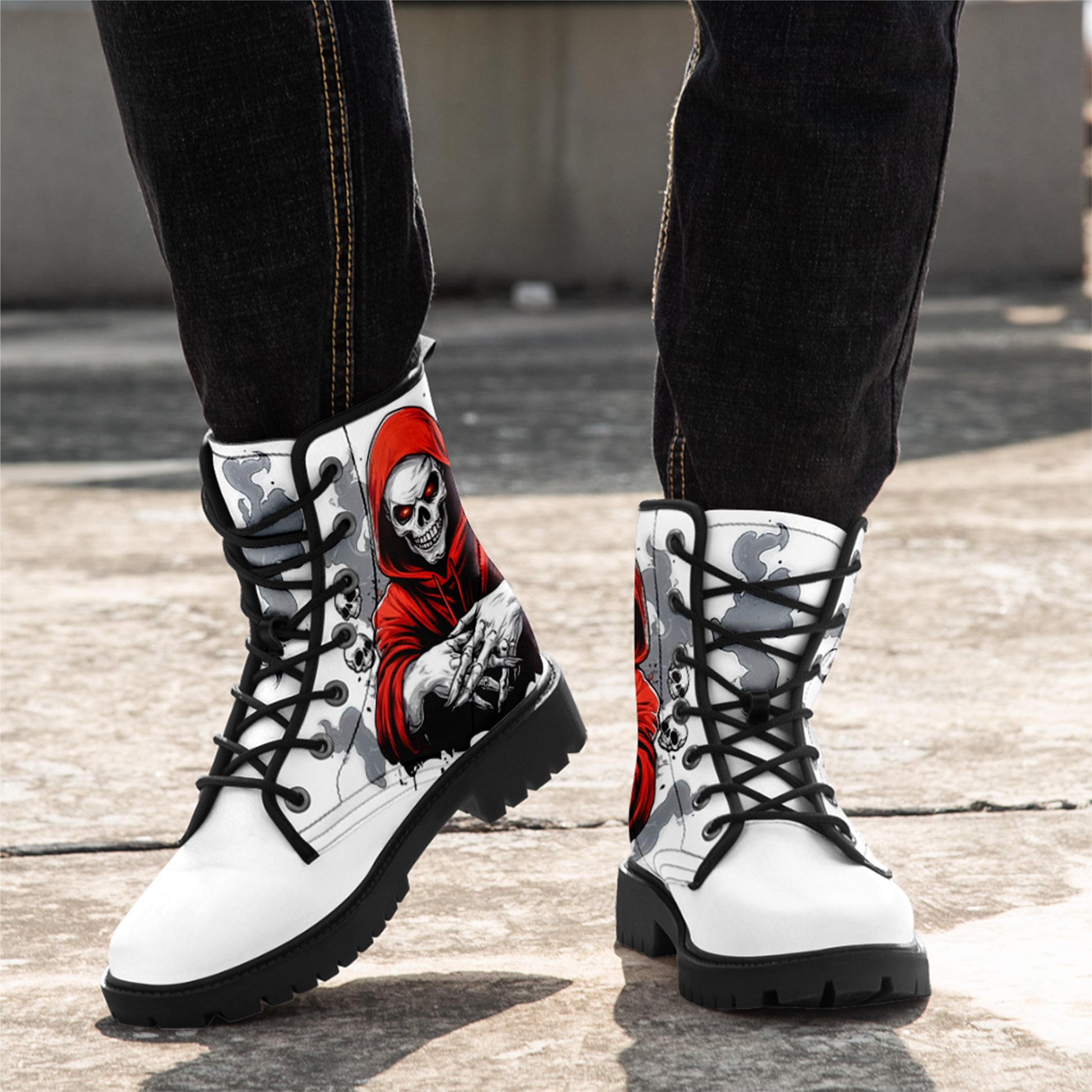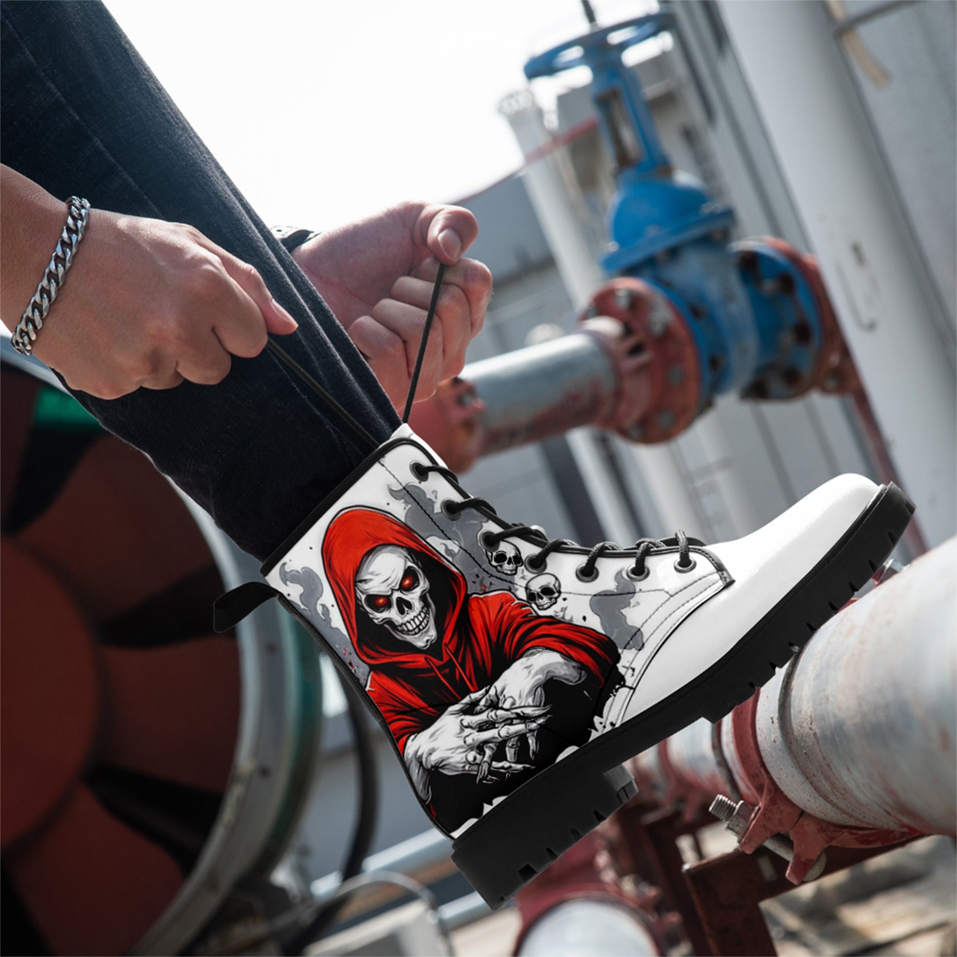 Clean style meets dark intentions. Stand out from the sea of black boots with this striking **white combat boot**, featuring a modern twist on the angel of death. The graphic showcases a **menacing skeleton rocking a blood-red hoodie**, surrounded by urban smoke and shadows.