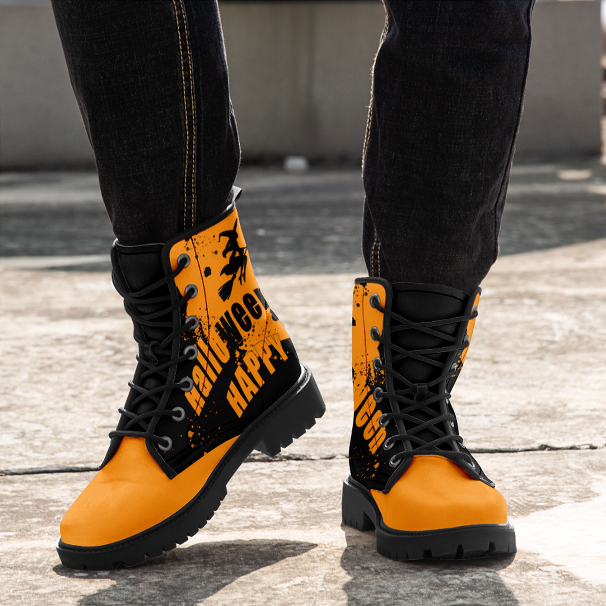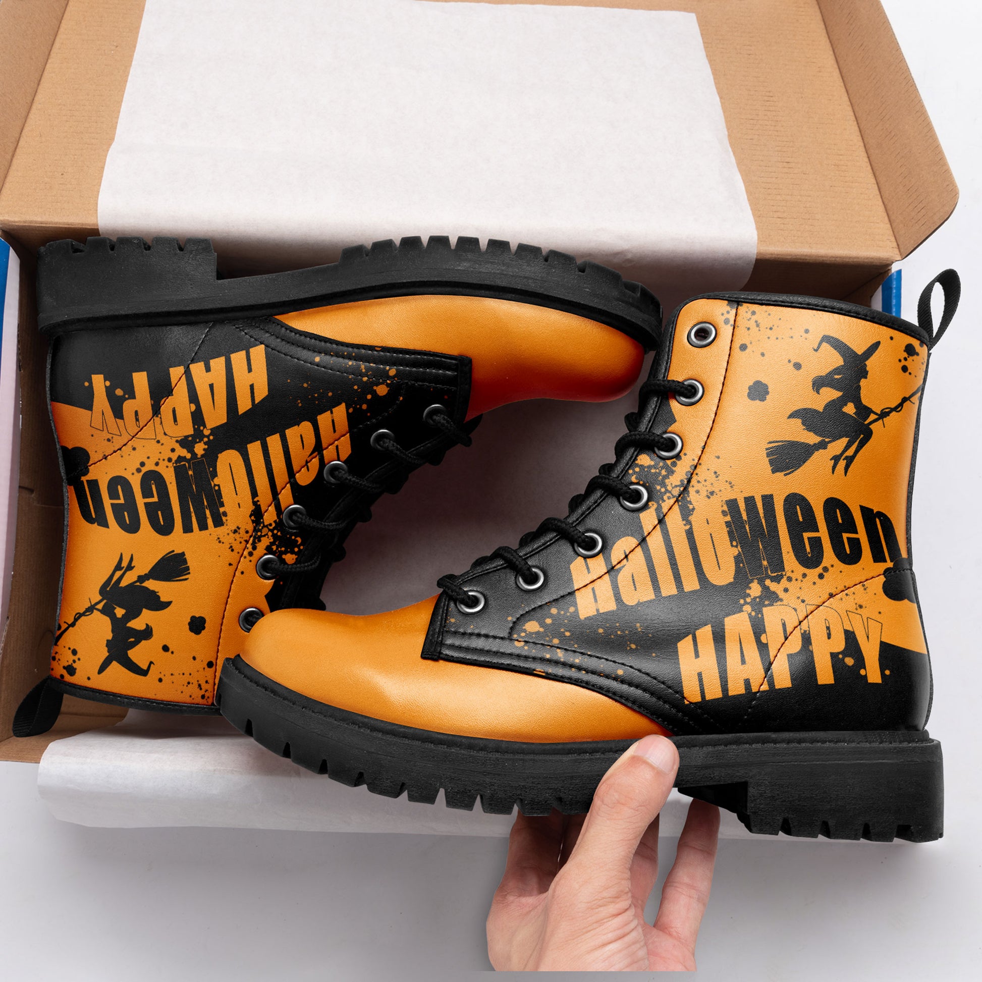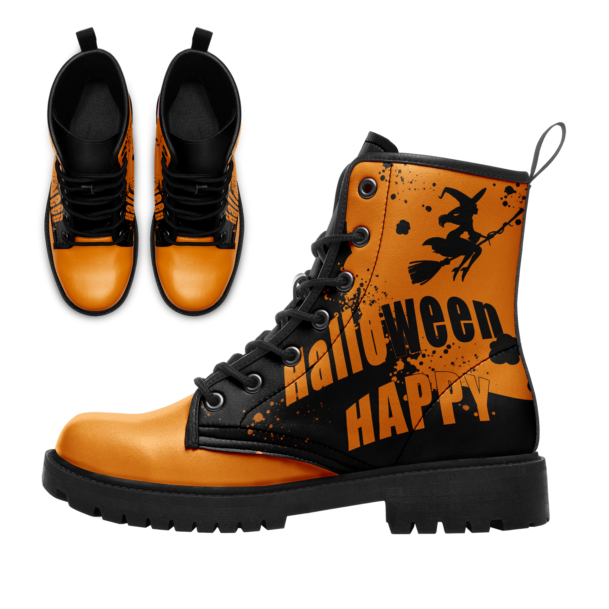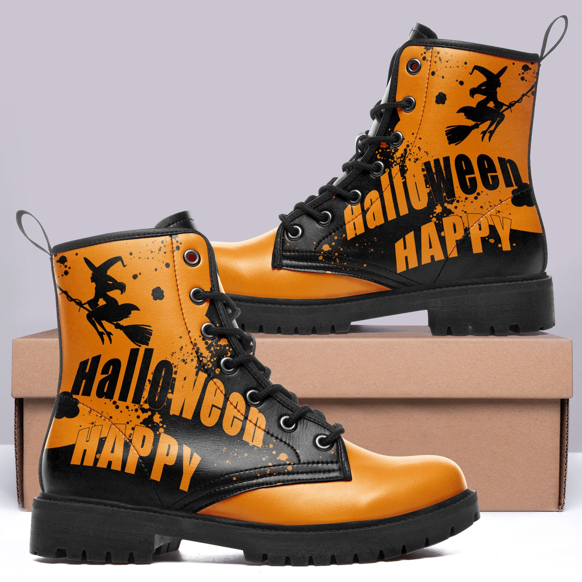 Get ready to fly! These **Happy Halloween Witch Silhouette Combat Boots** are the perfect blend of spooky tradition and modern grunge style. Whether you're brewing potions or just brewing coffee, these boots add a magical touch to your everyday look.