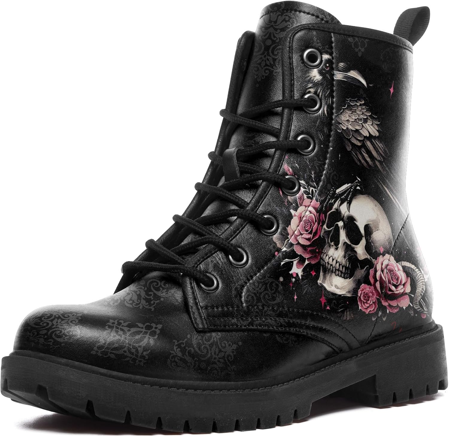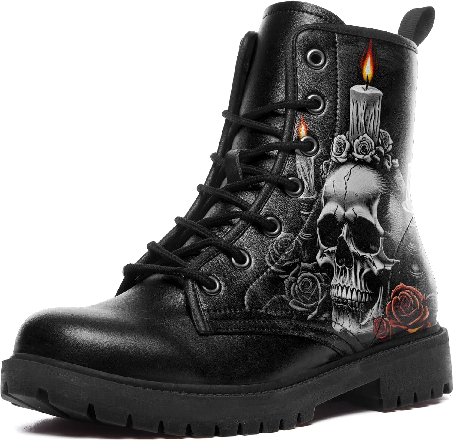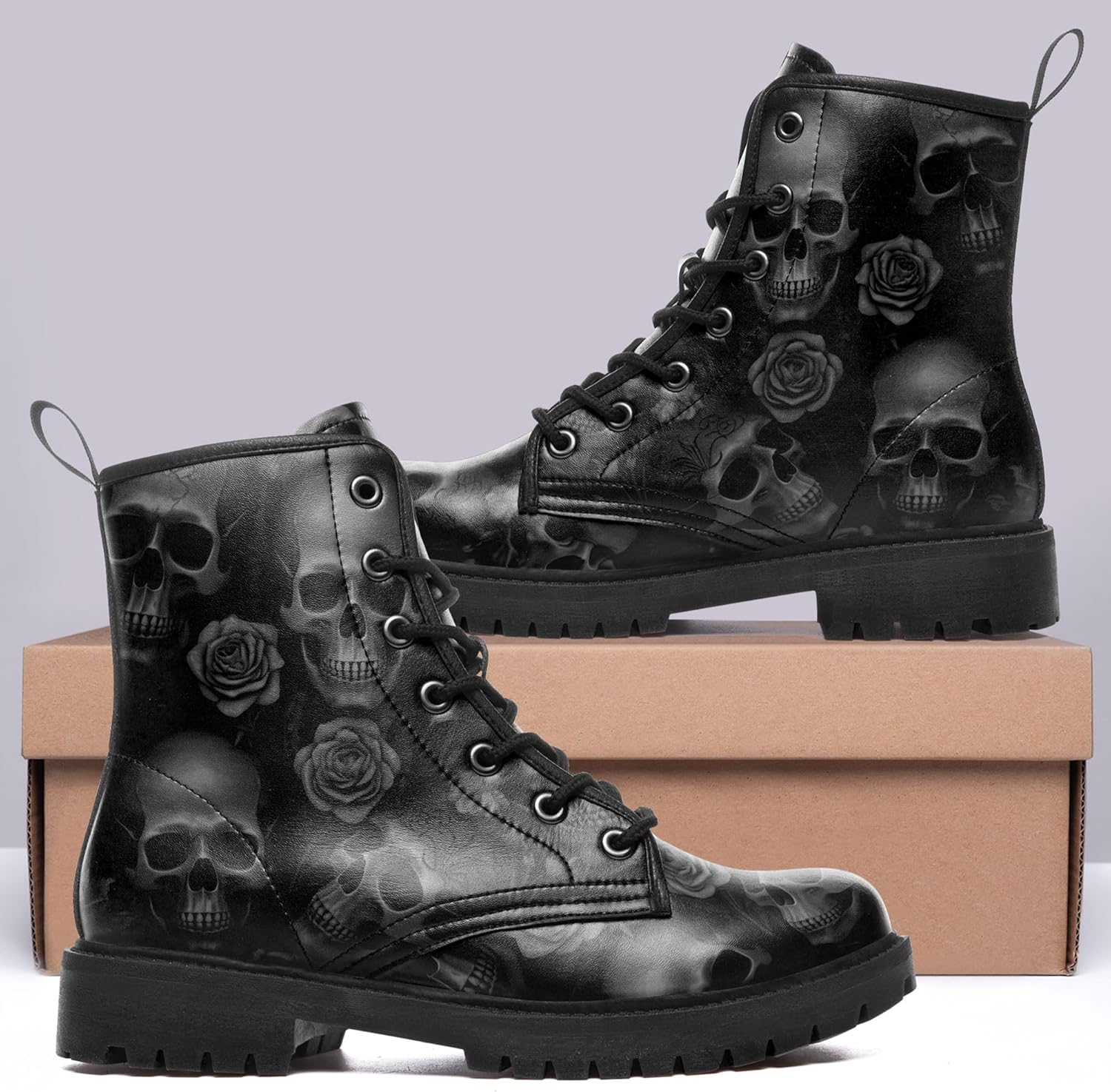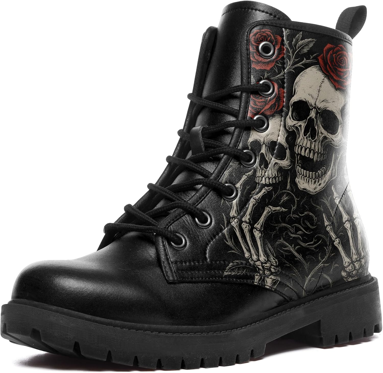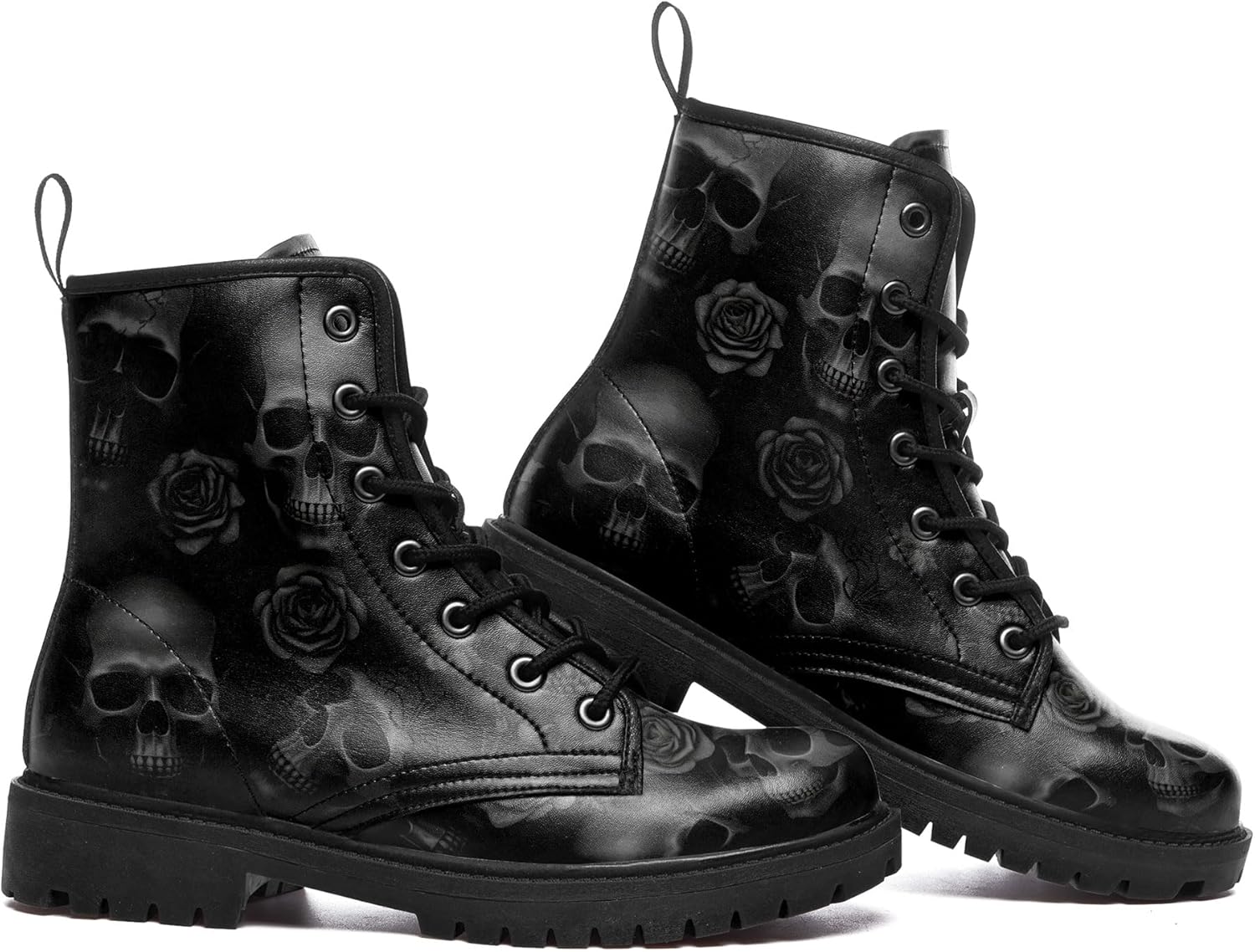 Womens & Mens Gothic Combat Boots | Punk Rock Vegan Leather Ankle Booties Anti-Slip Skull & Roses Black Platform Work Boots