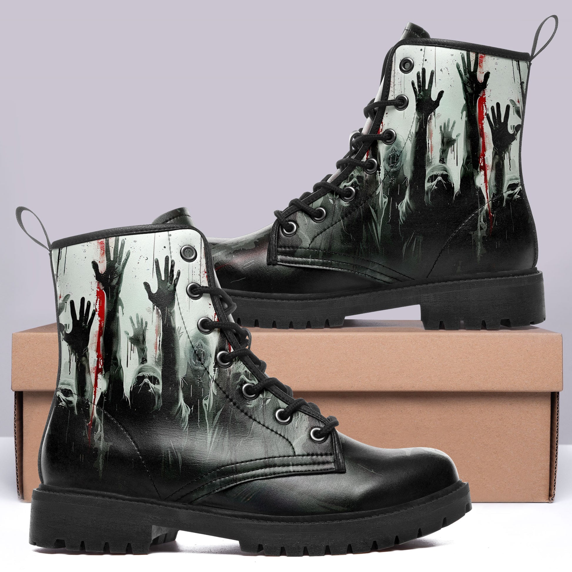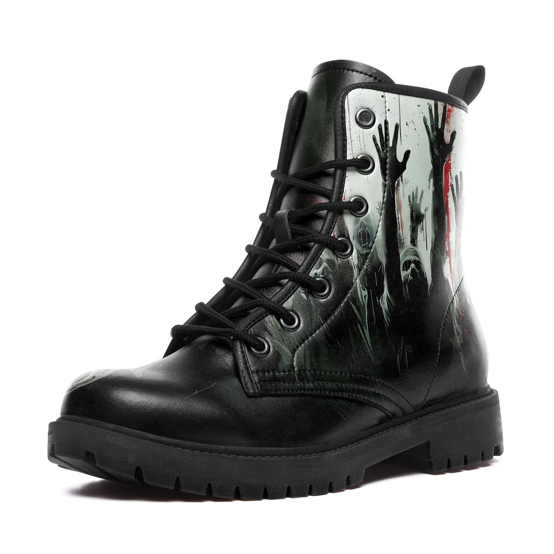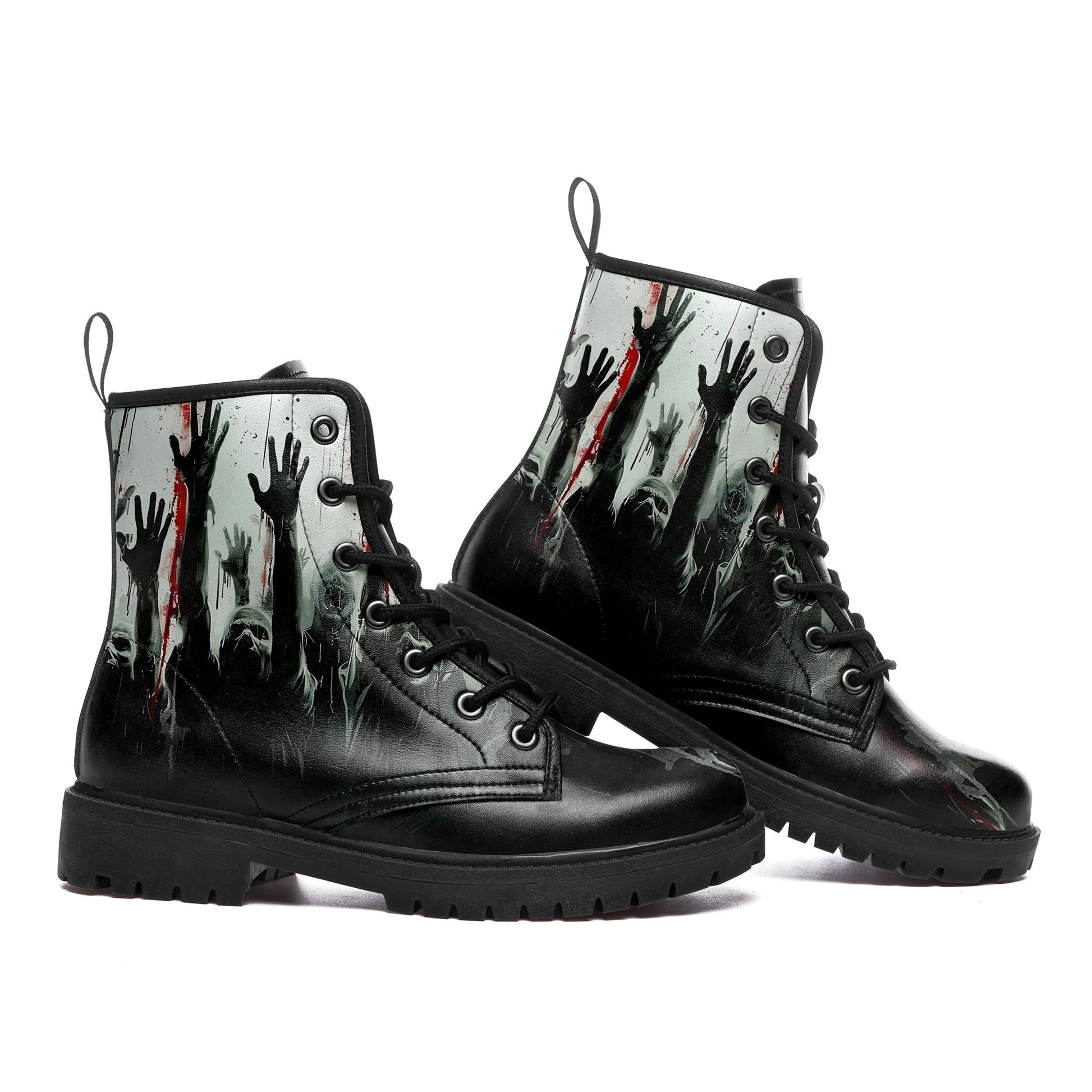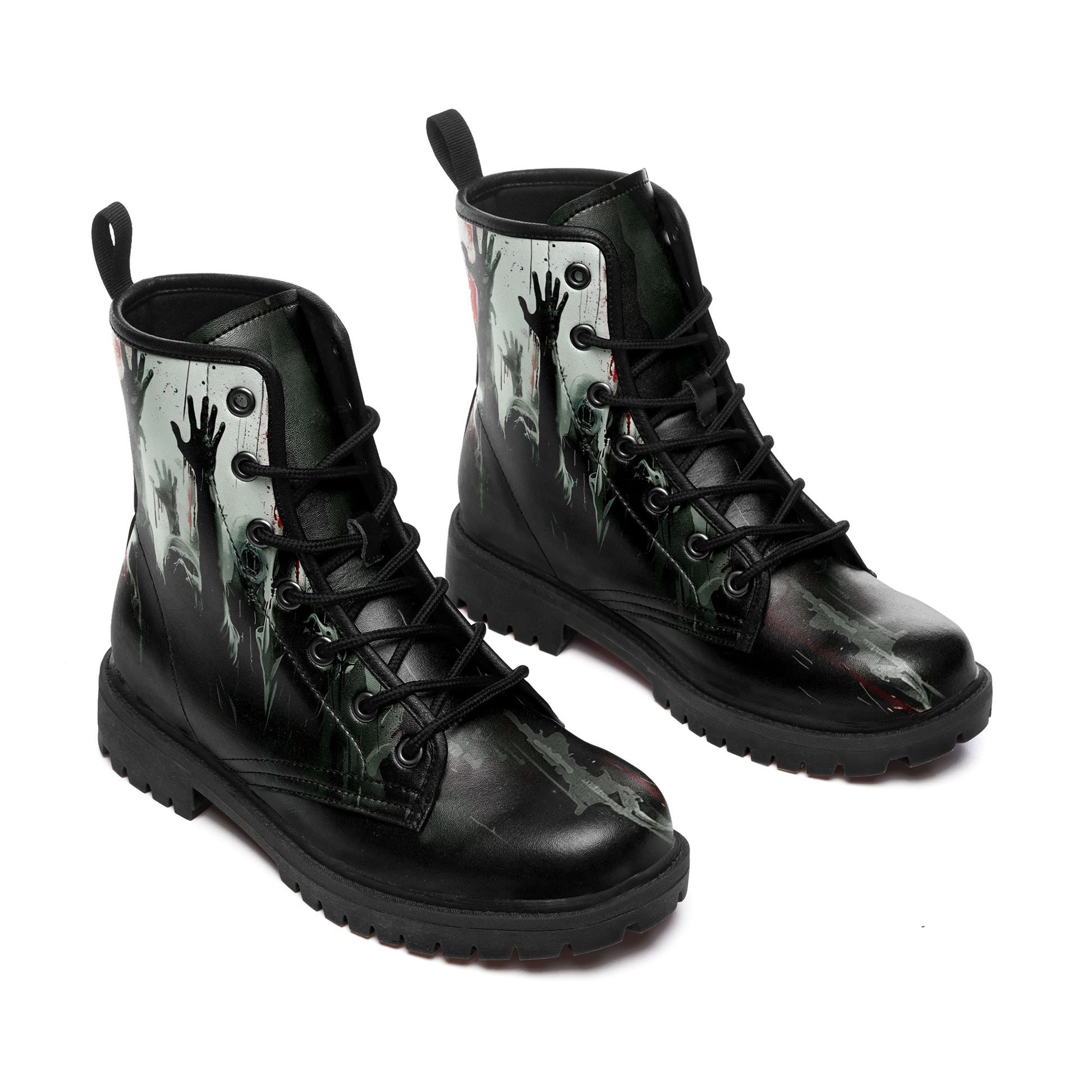 They are coming for you... but at least your footwear looks killer. These **Zombie Apocalypse Rising Hands Combat Boots** are designed for the horror fan who isn't afraid to walk among the undead.