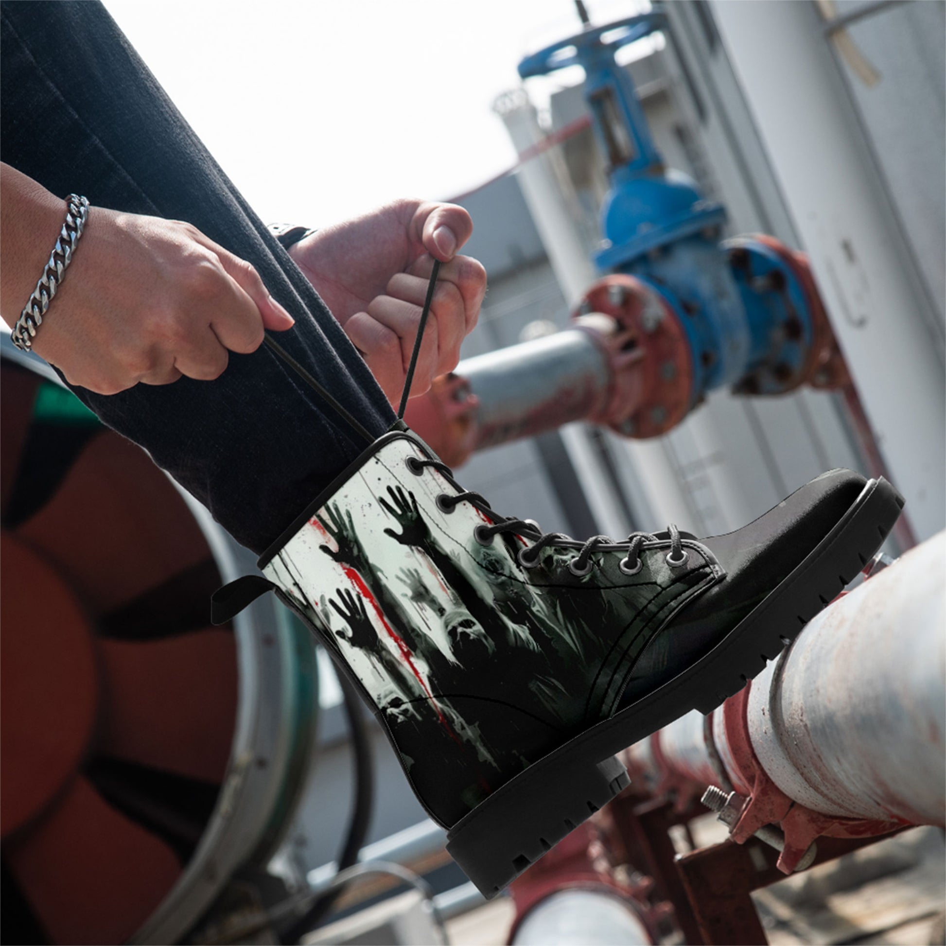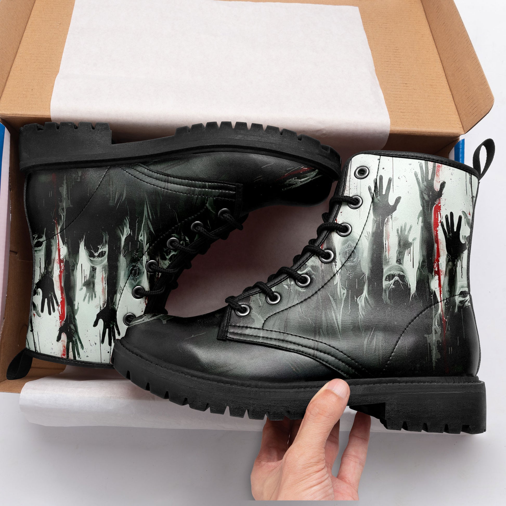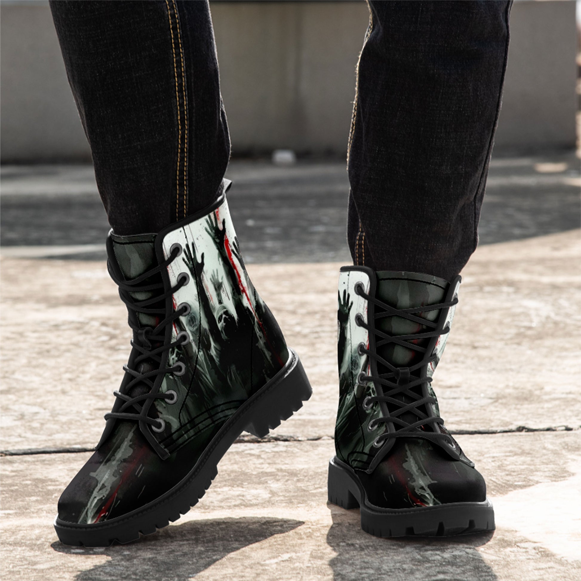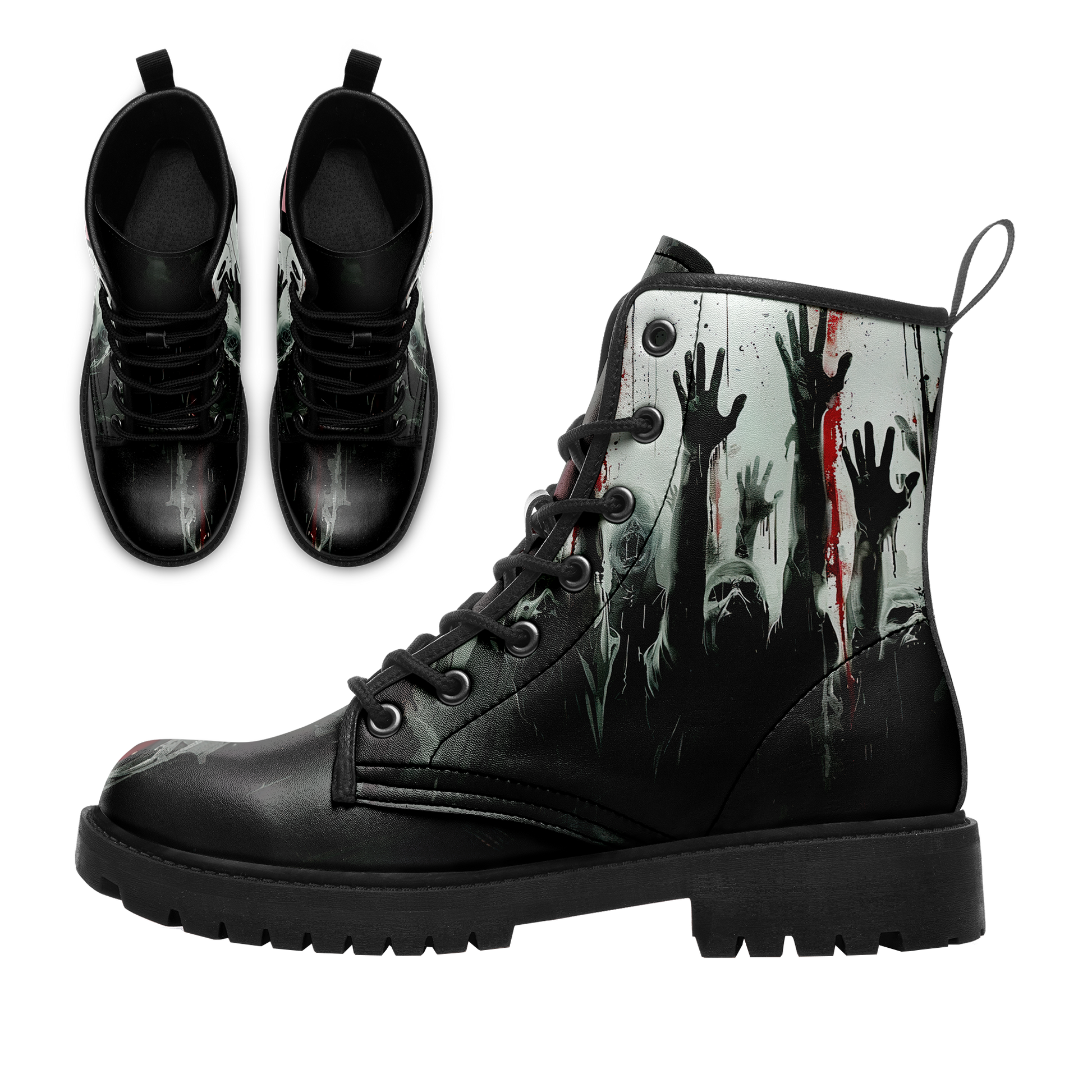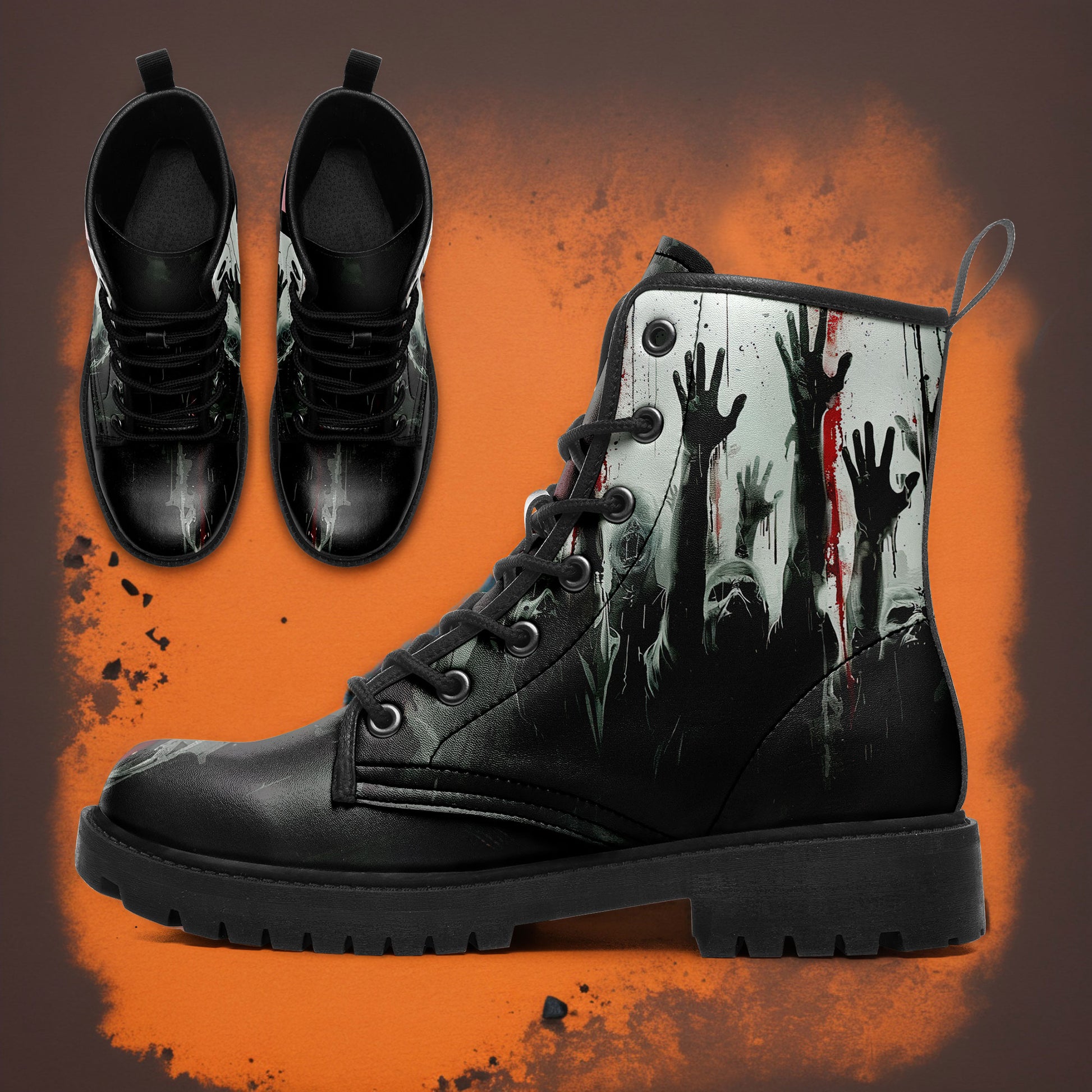 They are coming for you... but at least your footwear looks killer. These **Zombie Apocalypse Rising Hands Combat Boots** are designed for the horror fan who isn't afraid to walk among the undead.